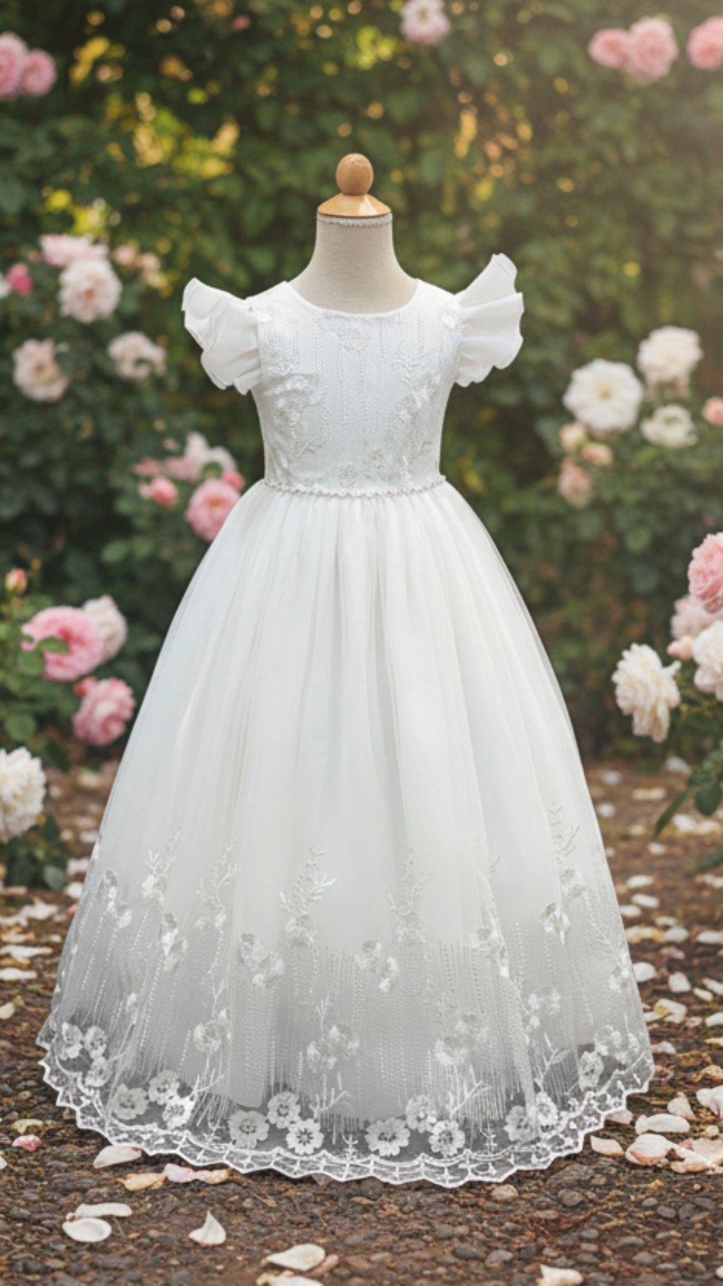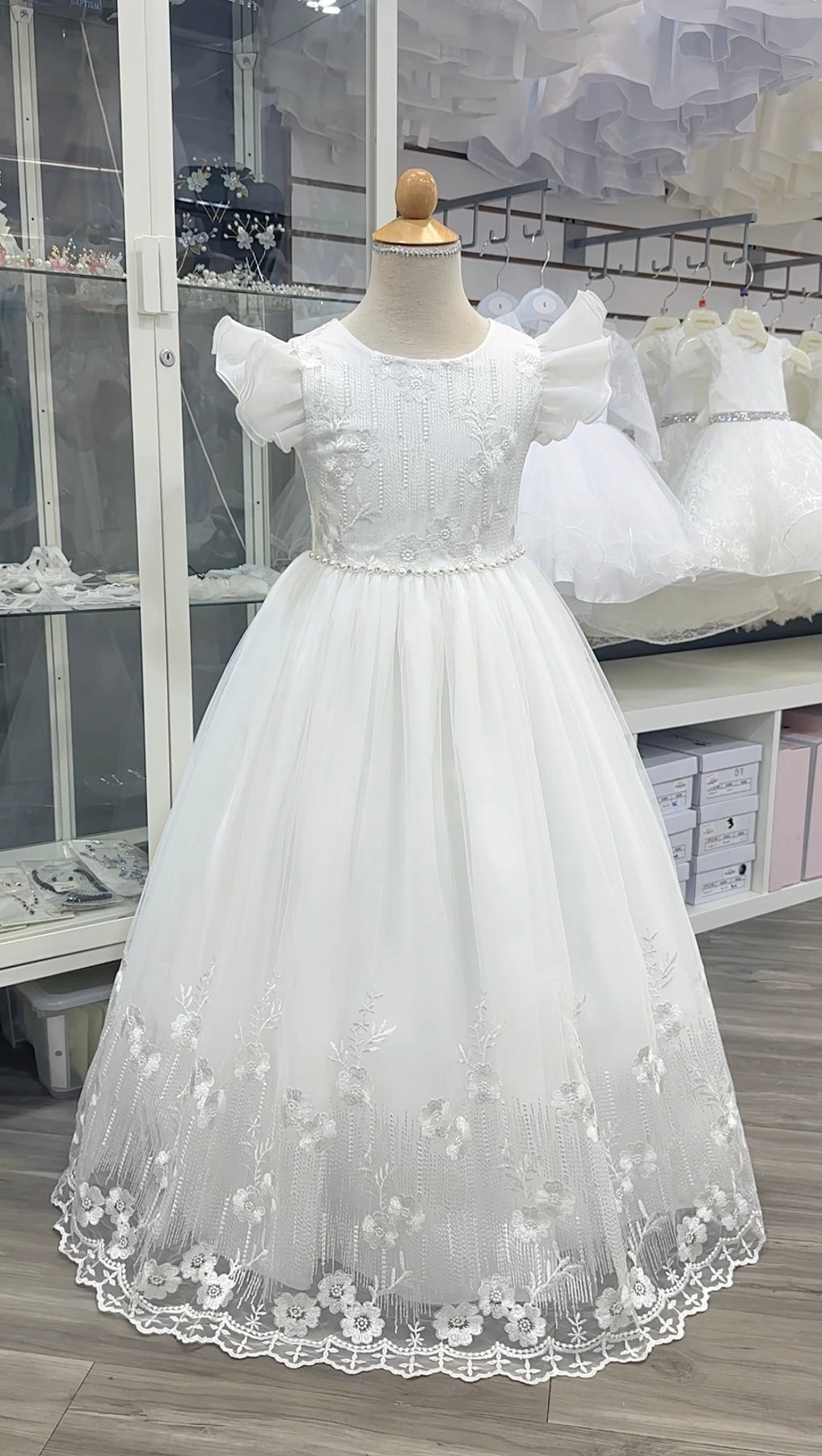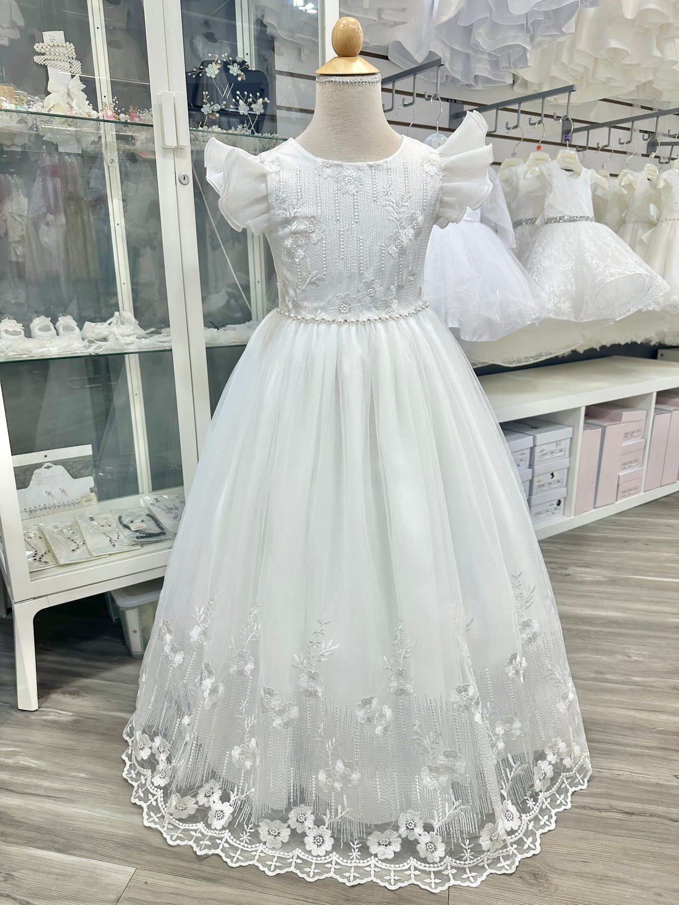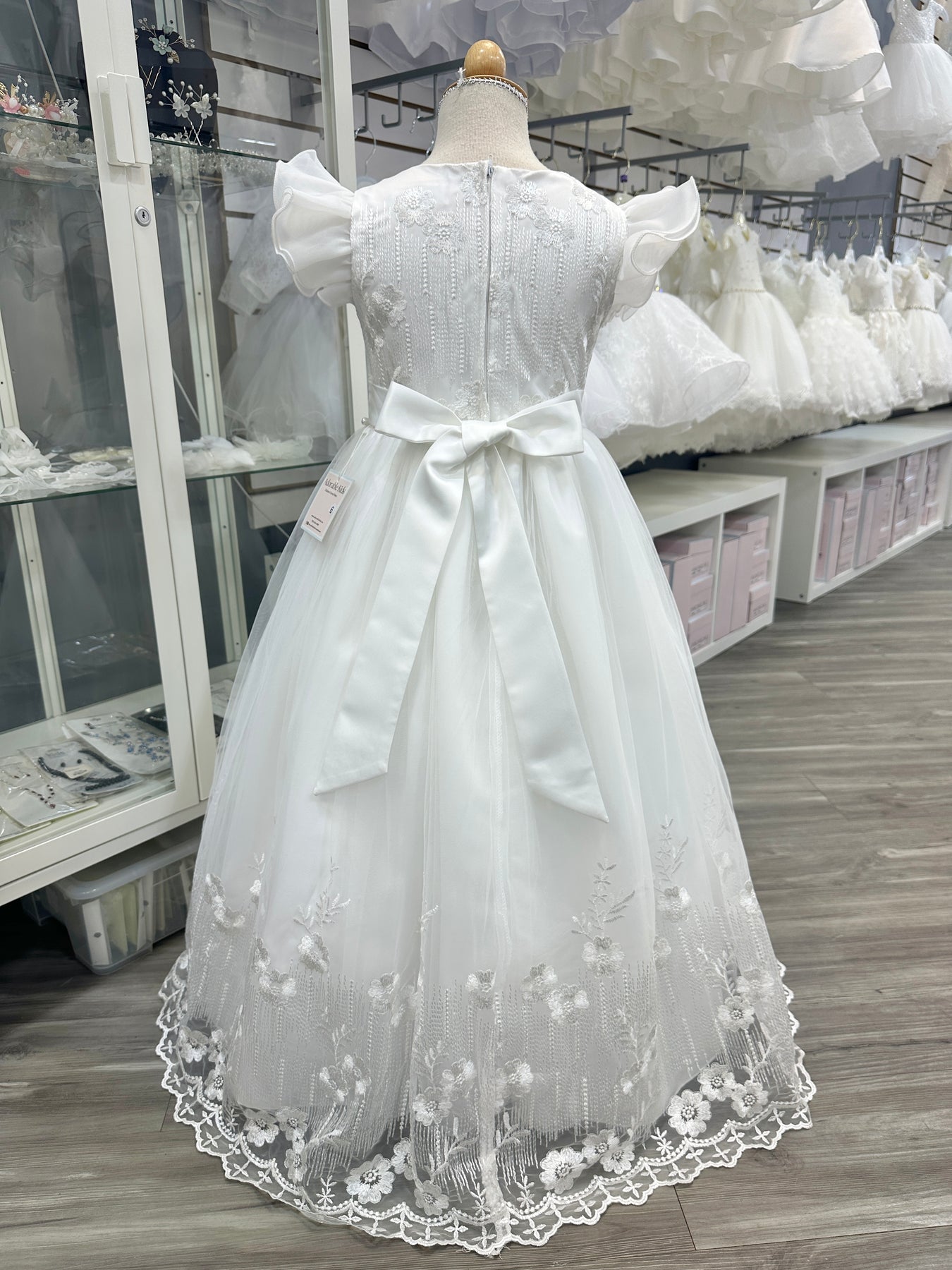 A perfect dress for a baby girl's Baptism, flower girls, birthdays, dedication or special occasions. Embroidered lace overlay with organza flutter sleeves. Waist is adorned with beads. Floor length. Tie back sash for proper fit. The back has zipper closure. Dress has sewn in crinoline to provide an elegant volume. Full cotton lining. This dress is well made and very comfortable to wear.  Dress is a very pale off white - a warmer tone compared which complements all skin tones. (You can't tell it is not white unless you put it side by side with a stark white).