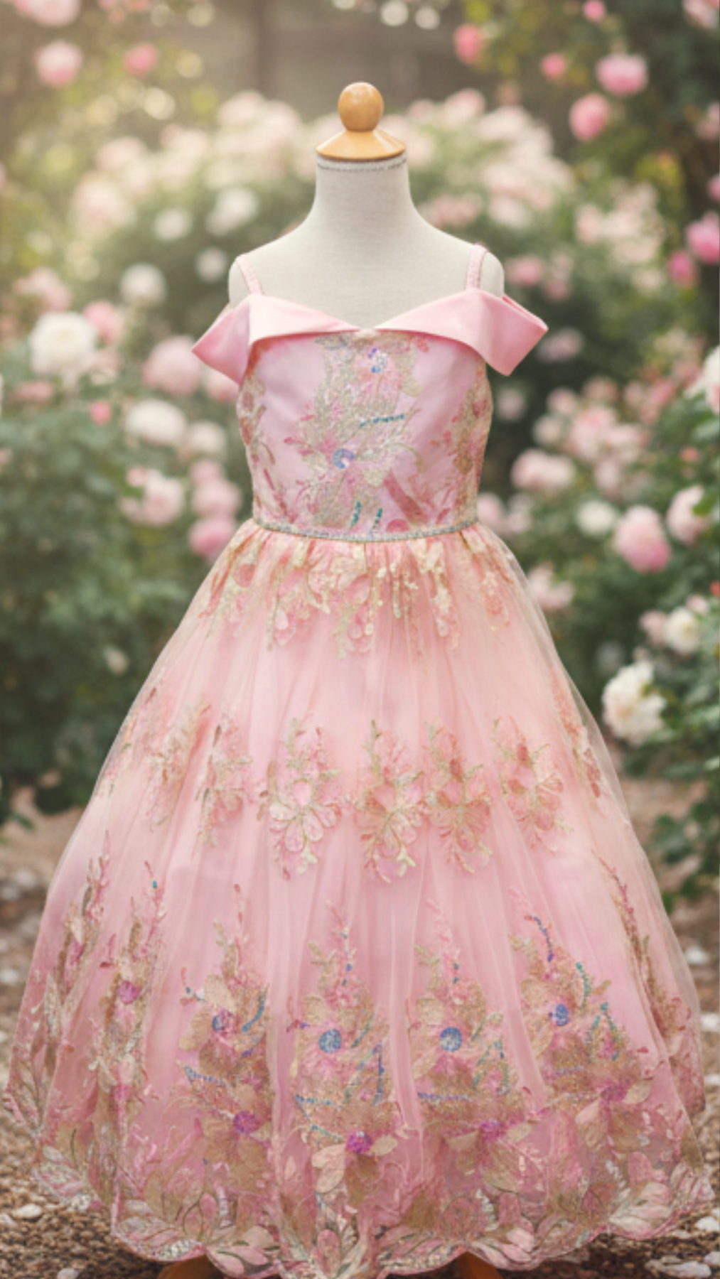 A perfect dress for Birthdays, Junior Bridesmaids, flower girls or special occasions.Embroidered tulle in very pretty colours, gold, pink topped with gold sequins. Trendy yet very classy off shoulder sleeves. Waist is  adorned with with  rhinestone jewels adding more to the beauty of the dress. Floor length tulle skirt finished with scalloped hemming. Tie back sash for proper fit. The back has zipper closure. Dress has sewn in crinoline to provide an elegant volume. Full cotton lining. This dress is well made and very comfortable to wear.